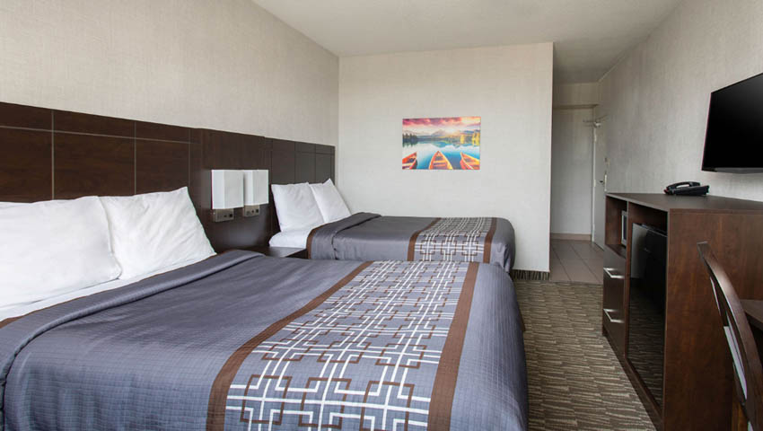 Ideal for shared accommodations or families, the spacious Double Queen Room offers two Queen beds, high speed Wi-Fi, a 40" LCD flatscreen TV, an alarm clock radio, and free local calls. Each room features a microwave and mini-fridge so you can snack and sip anytime. Enjoy a complimentary toiletries package in the bathroom, along with a hair dryer. Keep things organized with a convenient desk and chair right in your room, so you can get some work done without invading your sleeping space. This work space is only available in select rooms.